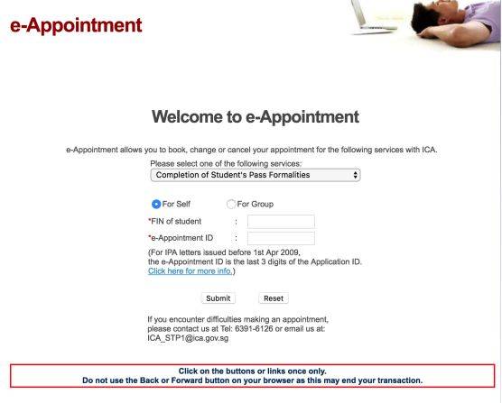 STP的办理,需要提前在线预约挂号。由于开学季,办理学生签的人特别多,所以建议大家在入境新加坡之前拿到IPA letter后便可以开始预约STP办理啦。大家可以前往新加坡ICA的官网上办理预约,在进入预约系统网页的服务项里选择”Completion of Student’s Pass Formalities ”。