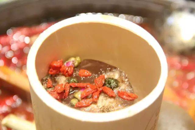 竹筒里面装着的是用18味中药草,经过20个小时熬制而成的,再冻成冰柱。架于火锅之上,草本冰柱会慢慢化成水,滴入火锅之中。