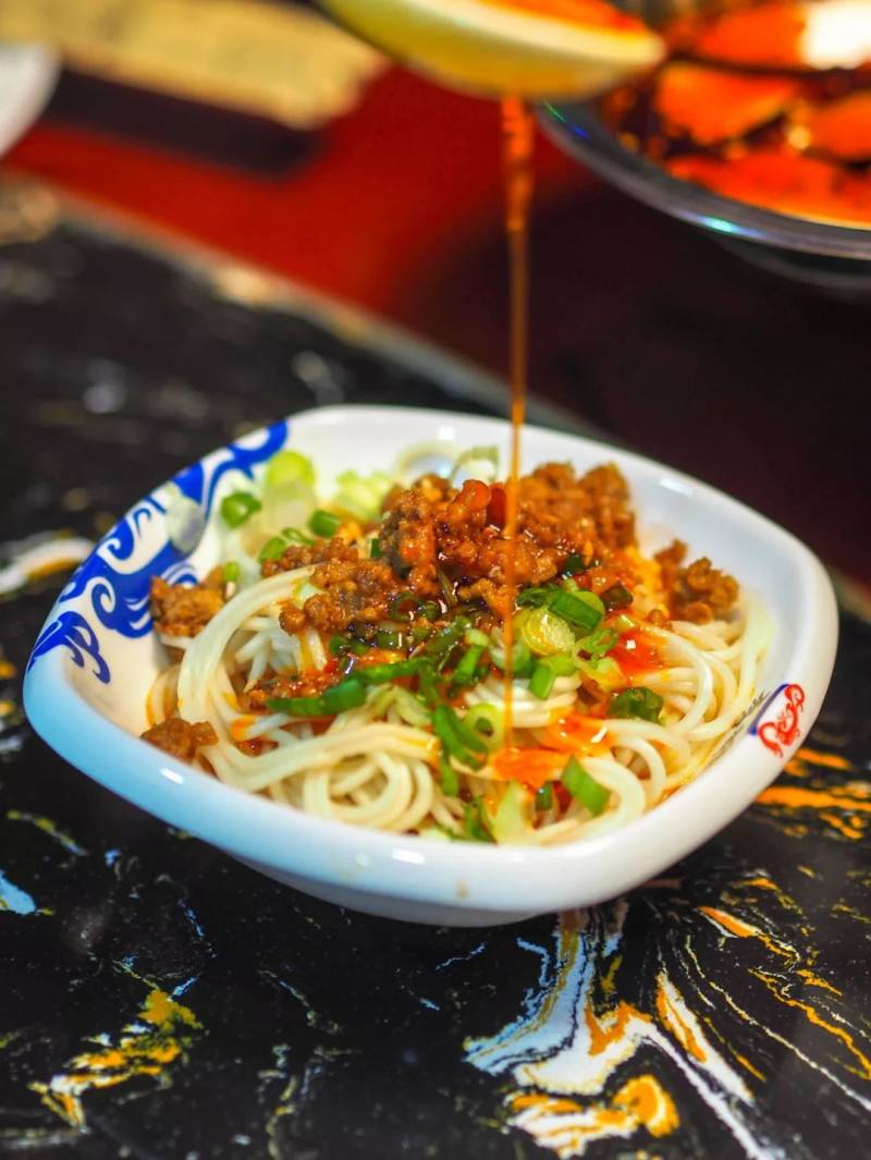 这是一家来自重庆的火锅店,也将重庆另一特色重庆小面带到店中。大小适中的一碗面上撒上肉末香葱,再淋上特制的辣酱油,香味十足。