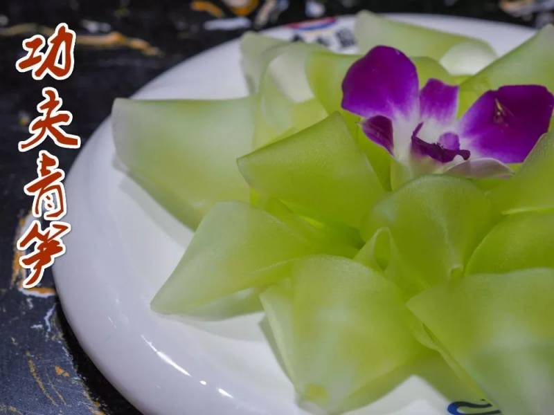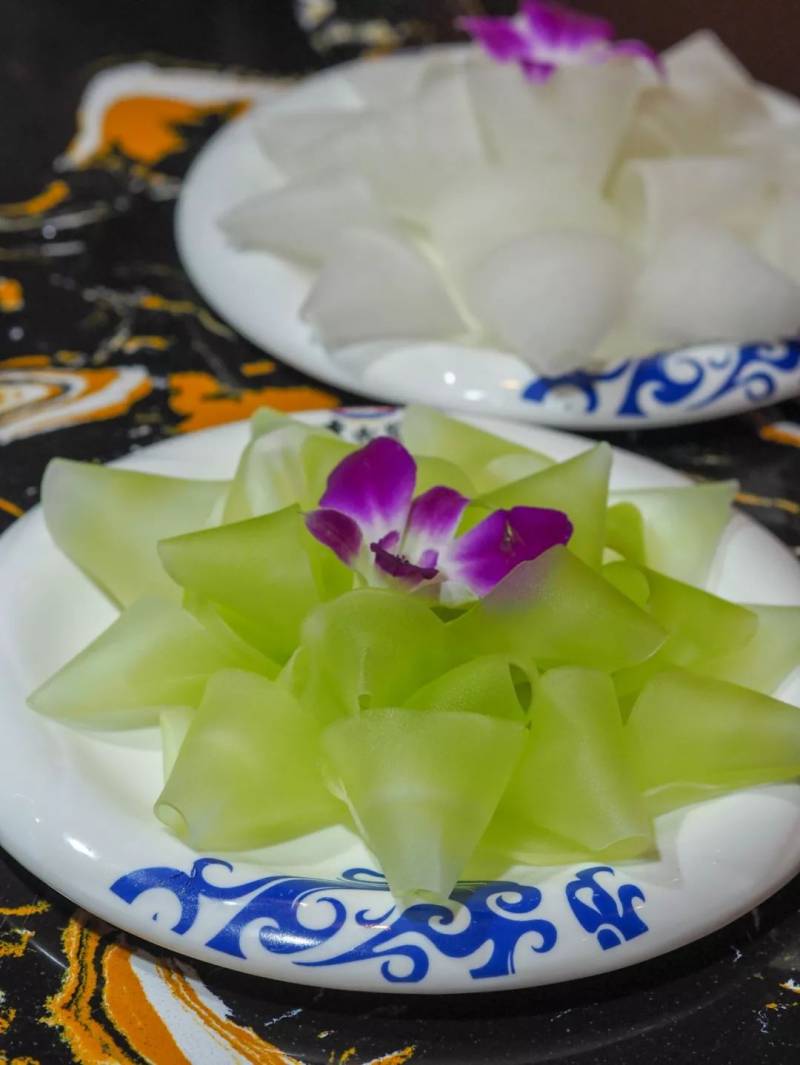 青笋和白萝卜被片成了透光的薄片,摆成花的形状,特别精致,真的是少点功夫都不行。