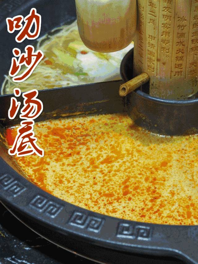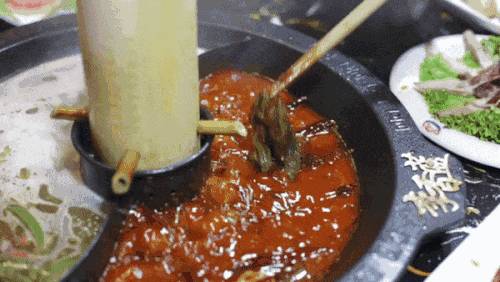 与鲜红麻辣的汤料交融, 起到清热解毒、美容养生的效果!这款冰竹滴水锅还获得了国家专利。