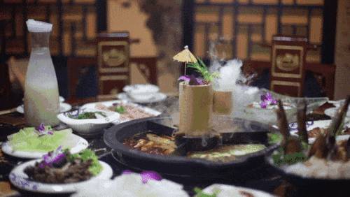 麻辣火锅吃的不少,但是这样子的锅还是第一次见。在火锅的中间架上了一个会出水的竹筒,究竟有什么作用?