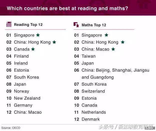 2016年12月6日,全球经济合作与发展组织(OECD)官网发出了最新的PISA报告,新加坡学生以数学564、阅读535、科学556的成绩力压群雄,夺得冠军!