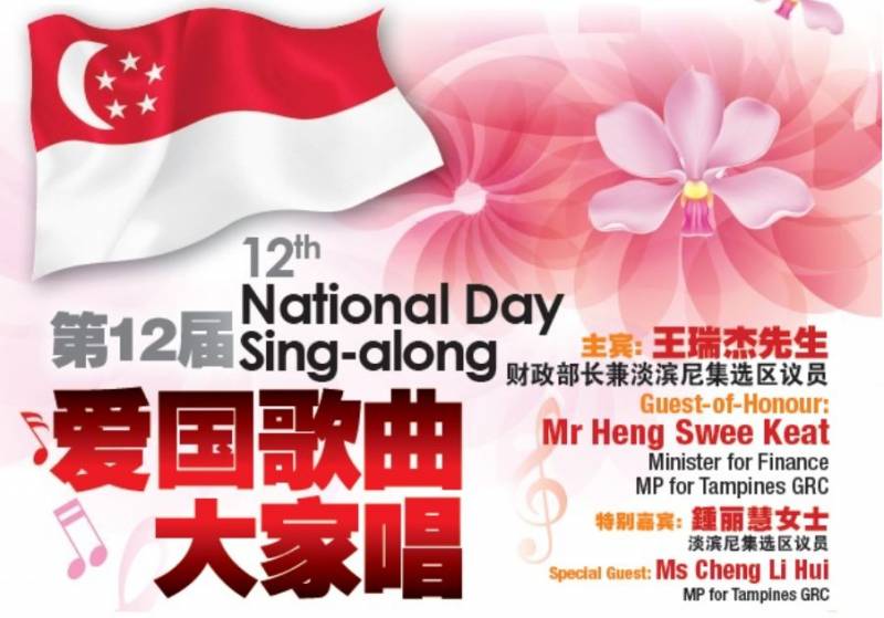 为欢庆新加坡独立53周年,新加坡宗乡会馆联合总会与新加坡华族文化中心举办 “爱国歌曲大家唱”。到时,财政部长兼淡滨尼集选区议员王瑞杰先生将以主宾身份莅临晚会,与民同乐。