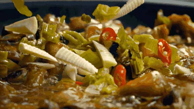 小火苗舔著铁锅底,让鸡肉和铁锅发生了“化学反应”,这可能就是《向往的生活》中的“柴火”味儿。