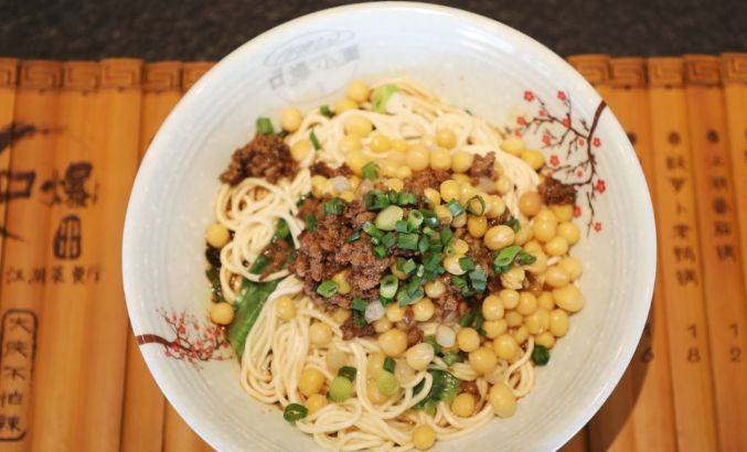 还有经典的重庆小面,豌豆、牛肉、肥肠、杂酱泼上香喷喷的油辣子,十几种佐料混搭。