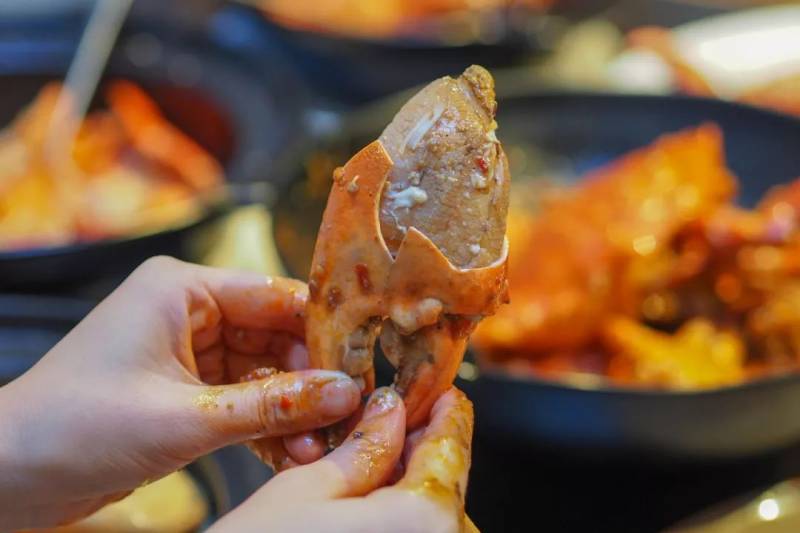 要吃辣椒螃蟹,就是要不怕脏了手。直接用手拿起螃蟹来大快朵颐,厚厚的蟹钳肉沾满了辣椒汁,每一口都是满足。