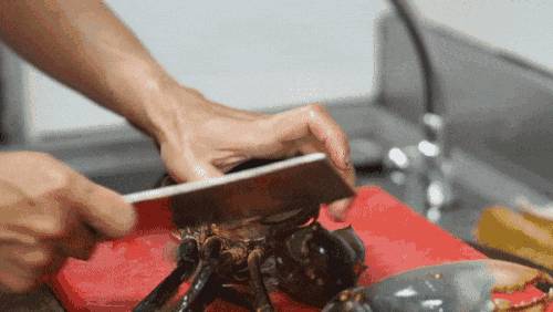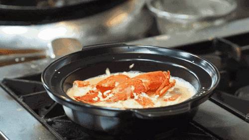 龙虾和前面的面包蟹一样,先用海鲜汤汆烫至熟。龙虾的甜味儿融入到汤中去。