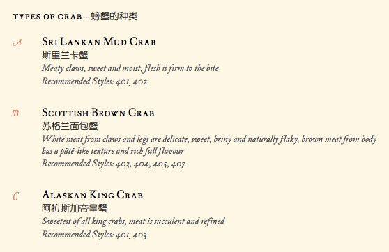 餐厅还非常贴心的在菜单上写出了每一种螃蟹的特点,以及适合用哪一种方式来烹调,保证客人吃到的都是最美味的螃蟹料理。