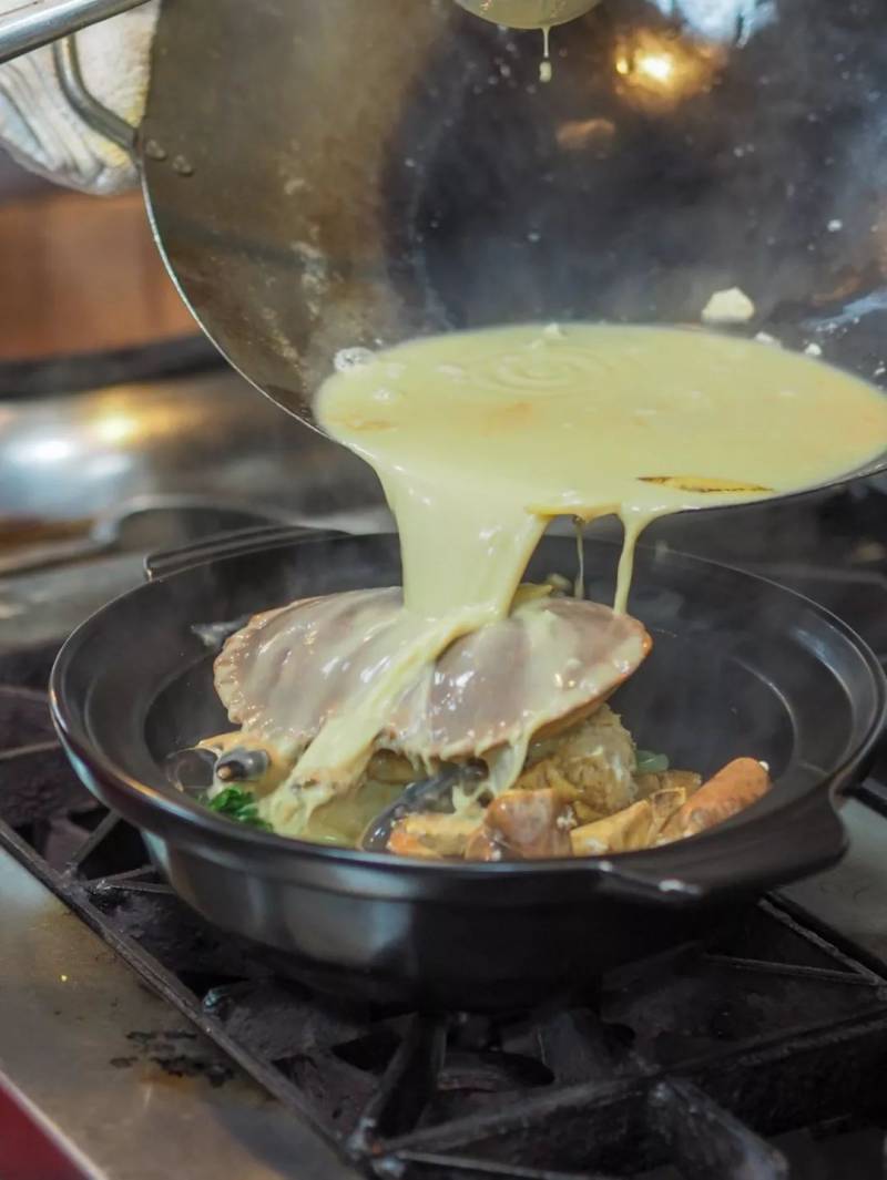 再将米粉、时蔬和螃蟹分别汆烫后放到沙煲中,再倒入加入淡奶的海鲜汤,在砂锅中稍稍焖煮一段时间。
