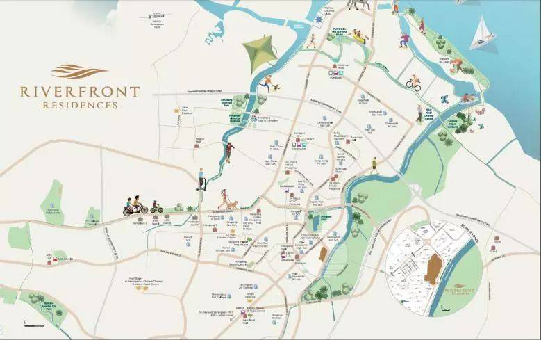 项目位于后港7道,从Riverfront项目步行到后港地铁约10分钟。由于靠近实龙岗水道(Sugei Serangoon),加建筑设计公司考虑周到的设计,大部分单位可以享受无阻挡的漂亮河景(在新加坡河景房属于罕见的),实龙岗水道边上就有公园通道,适合喜欢健身锻炼的朋友,一般跑步健身一边享受河流景观。周围有很多著名小学如圣婴小学,CHIJ女校,榜鹅小学(Punggol Primary School)等。