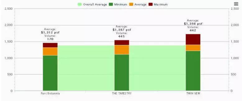 今年3月份热卖的淡滨尼项目Tapestry以均价$1387/平方英尺卖出445个单位,距离最近的地铁站Tampines West约1.5公里。在西部武吉巴督的项目心乐轩 Le Quest在去年8月份开盘以$1280/平方英尺卖出280间,在今年第二次开盘以均价约$1380/平方英尺卖出70间,该项目离地铁约2公里哦,今年5月份Twin Vew开盘第一天的以均价$1399/平方英尺卖出整个项目92%,现在剩余单位不多。还来说说位于盛港西Parc Botannia已卖出的单位均价约$1312/平方英尺,现在的价格1350~1380/平方英尺,需要坐轻轨4个站才可以到盛港地铁,相比Riverfront 可以直接步行到后港地铁,后港相比盛港更靠近市区,地理位置和价格都胜出,可见Riverfront的高性价比.