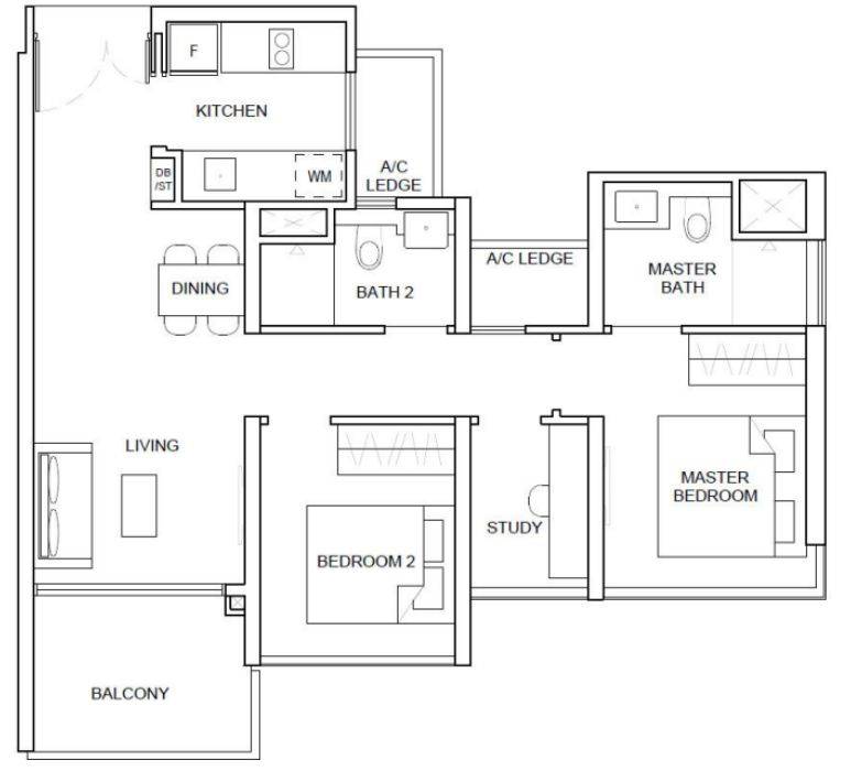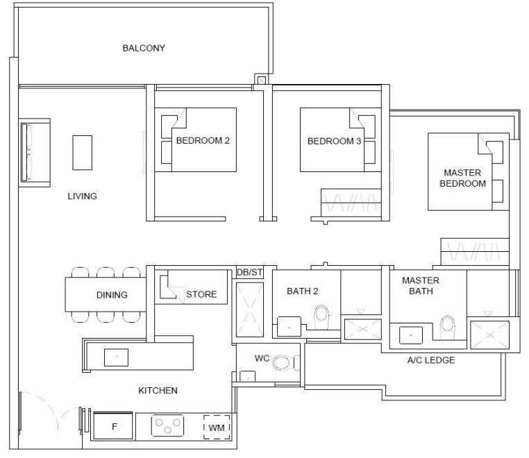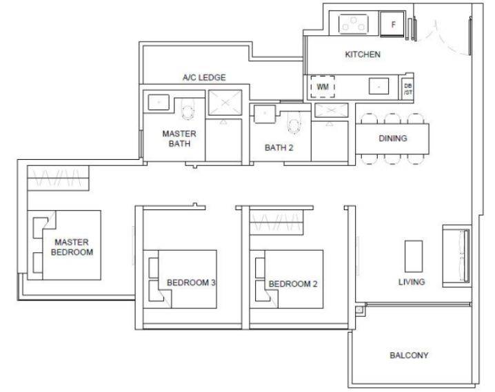 3房豪华型,91平方米/980平方英尺,带保姆房,每个房间都可以双人床,户型设计方正,价格152.1万起