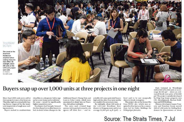 新措施发布当晚,三个新盘都抢著开盘,大家买房如买菜似的,连有些经纪自己也出手买了,一夜卖出1000余单位, 价值15亿多新币,当晚笔者也在现场经历的忙碌有疯狂的一晚,忙碌到凌晨5点才到家,充实而忙碌的一万,房产经纪们,发展商和买家们都一起忙碌的一晚,连银行贷款专员和律师咨询的电话也是打爆的节奏。