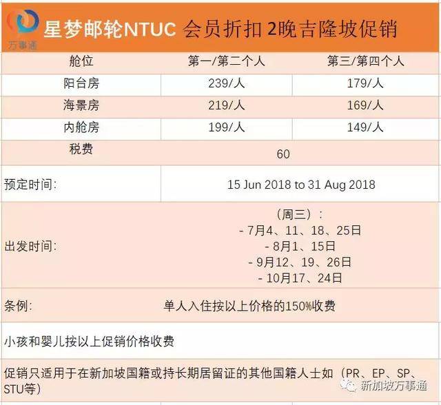 万事通特价:S$700一人起,第二位免费!(价格不包括服务费、港务费、自选岸上观光、旅游保险、交通、签证费及其他额外费用。)