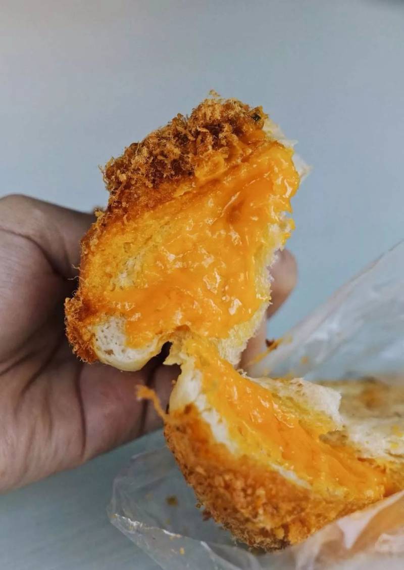 掰开这肉松面包,里面是金黄色的咸蛋流沙。吃起来除了咸中带甜的咸蛋味之外,还能吃到咖喱叶的香味,后味带微辣。