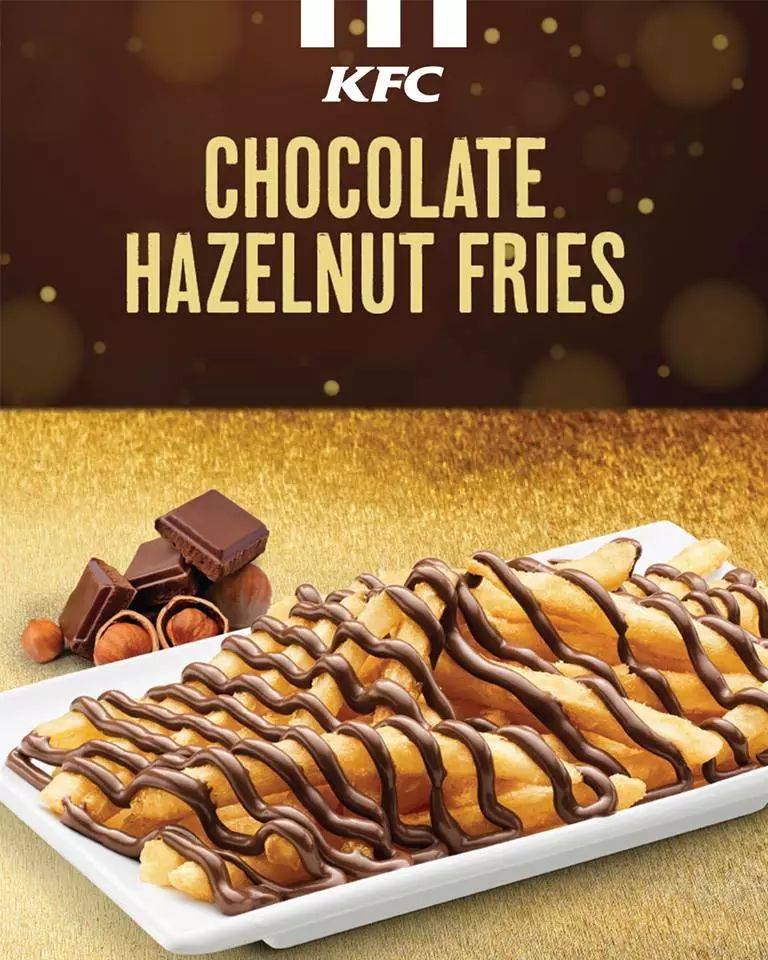 除了咸蛋炸鸡之外,KFC还推出了巧克力榛子薯条。觉得甜的薯条很奇怪?很多人喜欢薯条配软雪糕,所以这搭配应该是OK的。