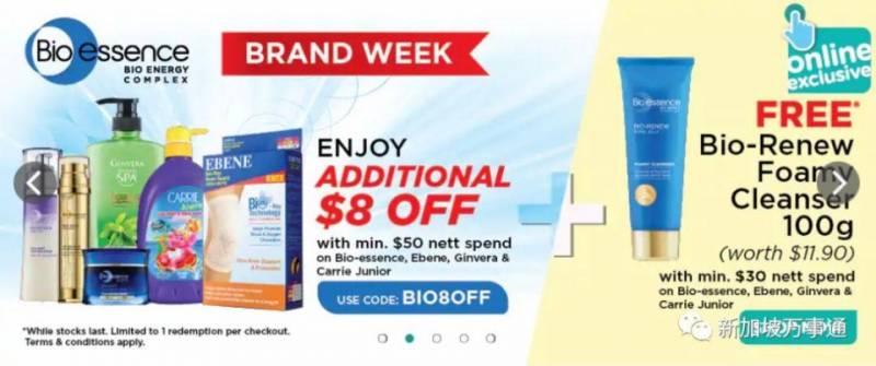 在屈臣氏网络上买Bio essence的商品满50新元就有8新元的折扣,还能同时获赠价值11.9新元的洗面奶。折扣码是:BIO8OFF