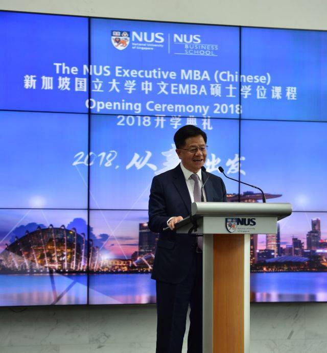 新加坡国立大学商学院院长杨贤教授在致辞中首先向同学们表示了热烈欢迎与祝贺,他指出“随着中国经济的发展,中国的消费力不断崛起,零售业销售额有望首次超过美国。而世界上最适宜求学的地点,不再只是欧美,更是在亚洲,而你们立足新加坡,在东西方的交汇融合之处,可以更好地把握现在,洞悉未来,预祝大家君子自强不息,不亢不卑,实事求是,以爱心及真诚,携手前行,共同追求美好的未来。”