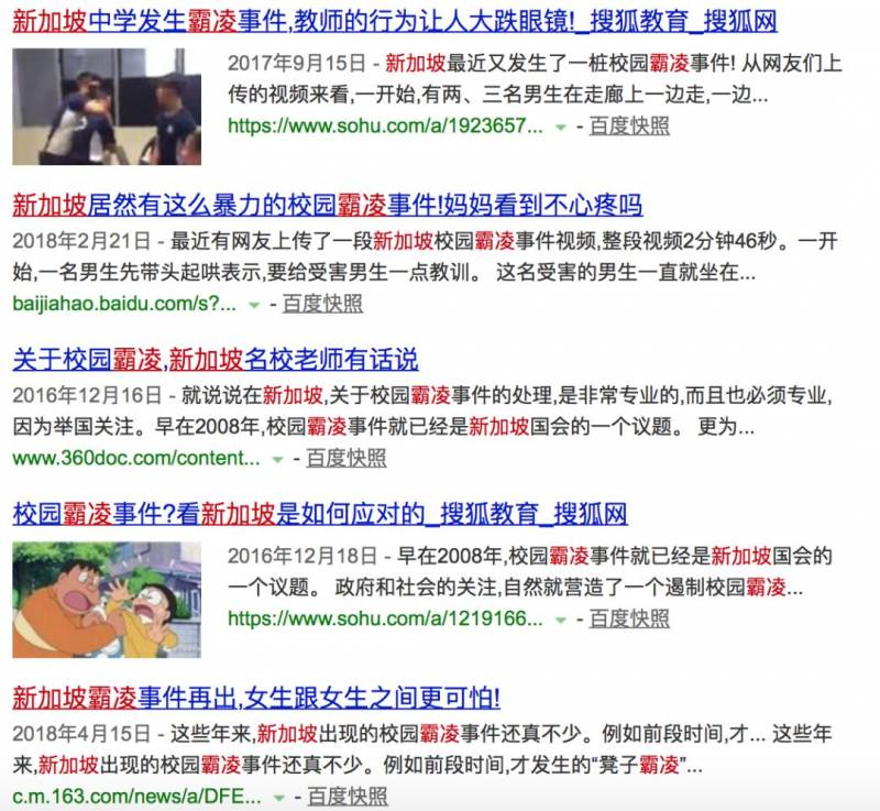 根据一个调查,在新加坡的中学里面,每4个人中就有1个曾经被欺负过;在小学,则是每5个人中有1个被欺负过。当然不仅仅是肢体的冲突,也有大量网络欺凌案例。