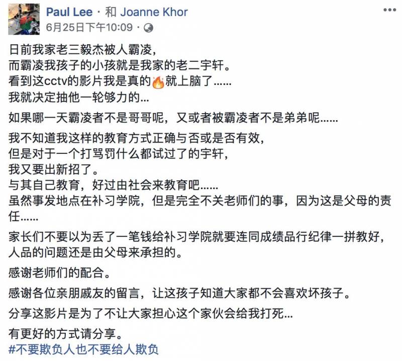 原来,据Paul Lee说,自己的小儿子在补习机构被人霸凌,这已经很让人心痛愤怒了!万万没想到,带头的竟然还是自己的大儿子!看到哥哥这么对待自己的亲弟弟,这位父亲表示,“我真的火就上脑了。”