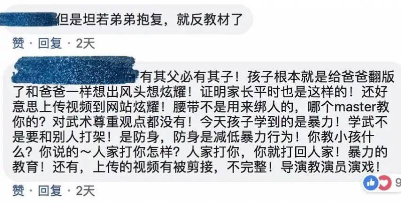 反对这种教育方式的网友认为,这位父亲在宣扬以暴制暴,用跆拳道的腰带绑人,既不尊重武术,也不尊重孩子。