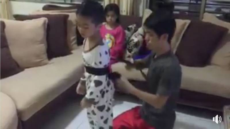 后来,哥哥哽咽著对弟弟说道歉说,“对不起,我错了。”听到哥哥的道歉后父亲面色有所缓和,但并没有停止继续教育,他让被绑着的哥哥趴在地板上,问他: