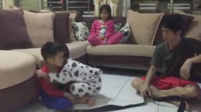 在哥哥承认自己踢了弟弟以后,父亲叫女儿拿来跆拳道腰带,把大儿子紧紧捆绑起来,要他“将心比心,感受被霸凌。”