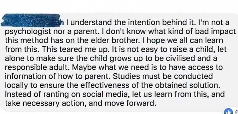 (翻译:我明白父亲背后的意向。我不是心理学家,也不是父母。我不知道这种方法对哥哥有什么坏影响。但希望我们都可以从中学习,这个视频让我我泪流满面。抚养孩子并不容易,更不用说要确保孩子长大成为文明并负责任的成年人。研究必须在本地进行,以确保获得的解决方案的有效性。不要在社交媒体上咆哮,让我们从中吸取教训,采取必要行动,向前迈进。)