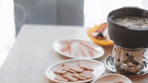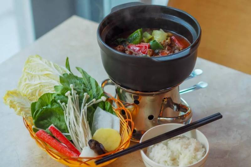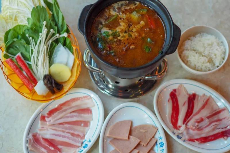 小火锅里可以汆烫各类时蔬,还为喜欢吃肉的人搭配了肥牛片、五花肉片或者是午餐肉,一锅可以有好几种吃法。