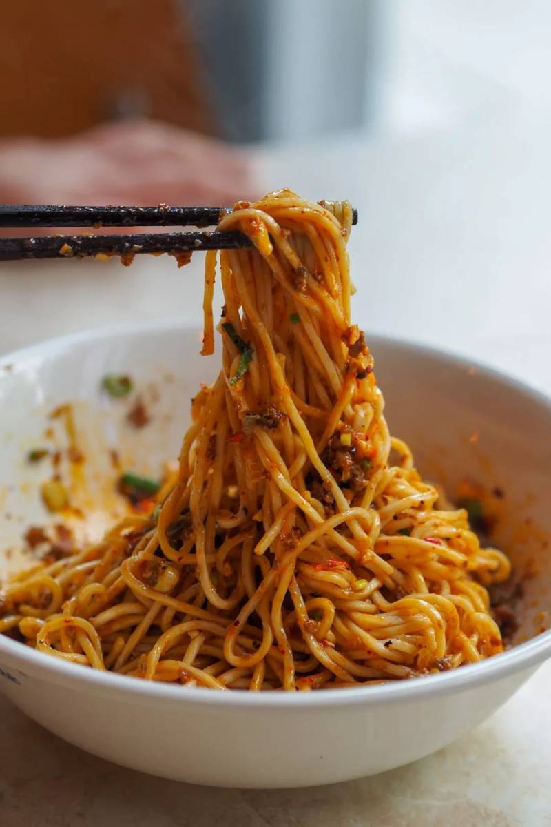 吃燃面最重要的一点就是要快!面一端上桌就要着手开始快速搅拌,将燃面上的辣椒、葱花、花生碎等配料和面均匀的搅拌在一起。还未拌匀就已经混合发散出令人灵魂颤抖的香气。
