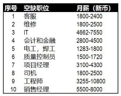 公布了新加坡最缺人的十大行业