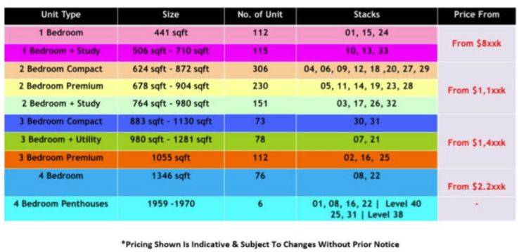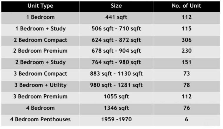 从下图可以看出,总共1259个单位,有1房,1+书房,2房普通型,2房豪华型,2+书房,3放普通型,3房豪华型,4房,不同户型供大家选择,适合投资或者买来自住。