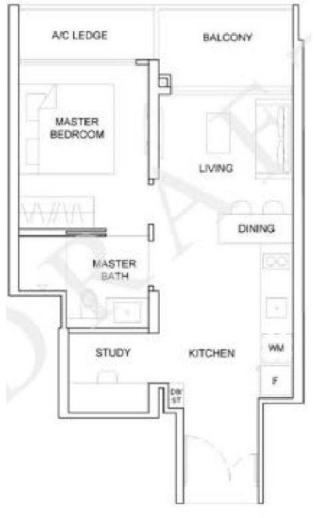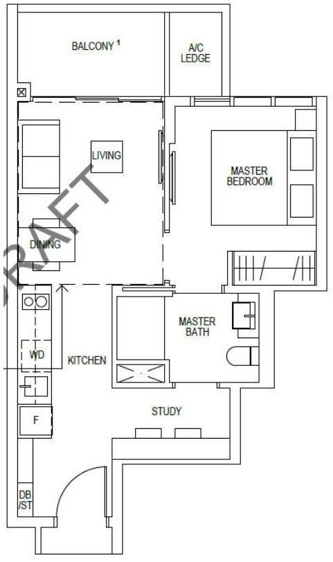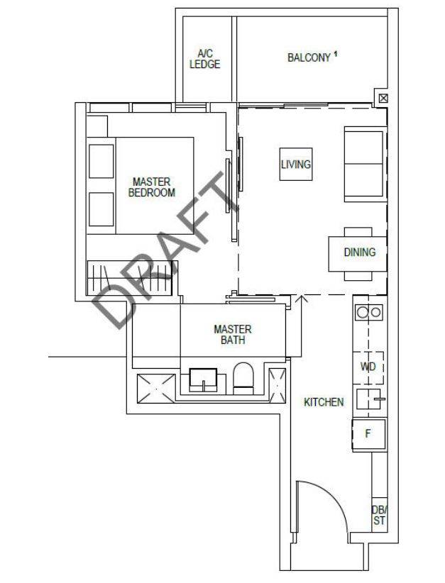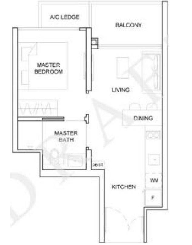 1房户型,43平方米/ 463平方英尺,适合单身人士和年轻的情侣住