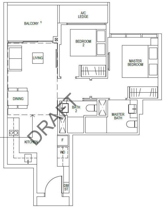 2房普通型,57平方米/ 614平方英尺,可以改成封闭式厨房