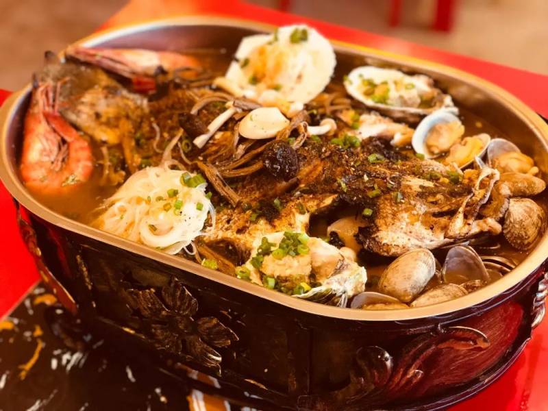 选用金目鲈为原料,每天凌晨到货, 现点现杀只有活鱼才能烤得出:肉质Q弹,口味鲜甜,汤汁饱满!除了分量十足的金目鲈外,辅料也极为丰富, 港口之运 的生蚝、扇贝、老虎虾和鲜活拉拉 用猪大骨和老母鸡熬煮8小时而成的底汤,滋味浓郁,鲜味十足!还有 6种秘制口味,全方位满足你的味蕾!