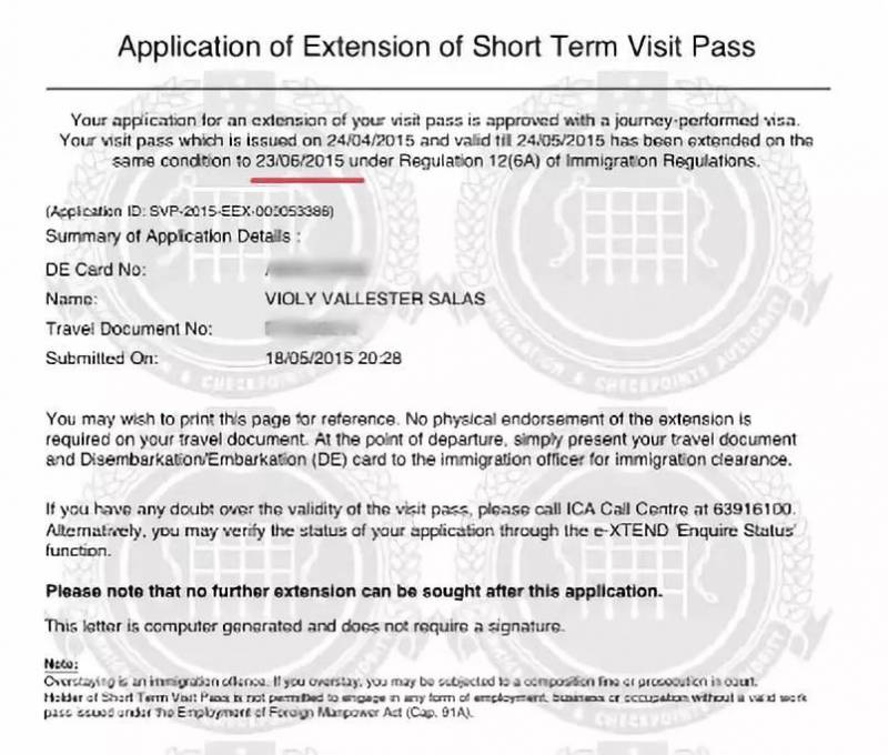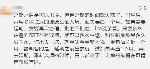 “Visa和Visit Pass是两种不一样的概念。Visa是使得你能够入境新加坡的,Visit Pass是你能够合法逗留的通行证。希望你可以注意到,延期的逗留通行证意味着你可以逗留新加坡,一旦离开了就不再有效(失效),并不是多次入境的通行证。”