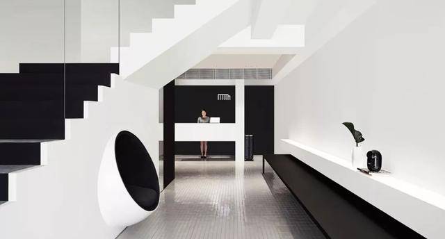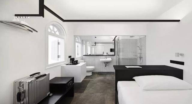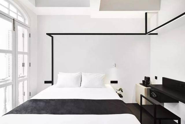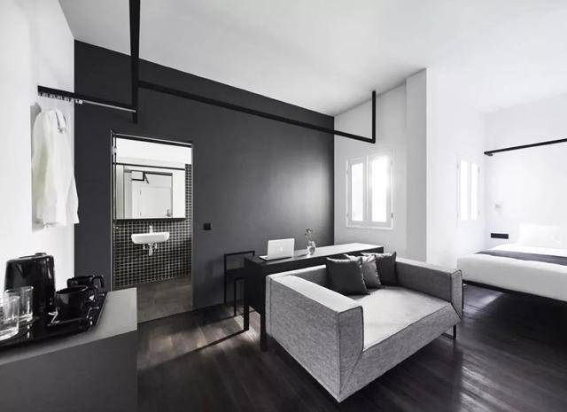 黑与白主题风的一家酒店,由一个黑色的金属杆作为主体元素依次串联其每个房间,兼作灯架、衣架以及视觉装置。