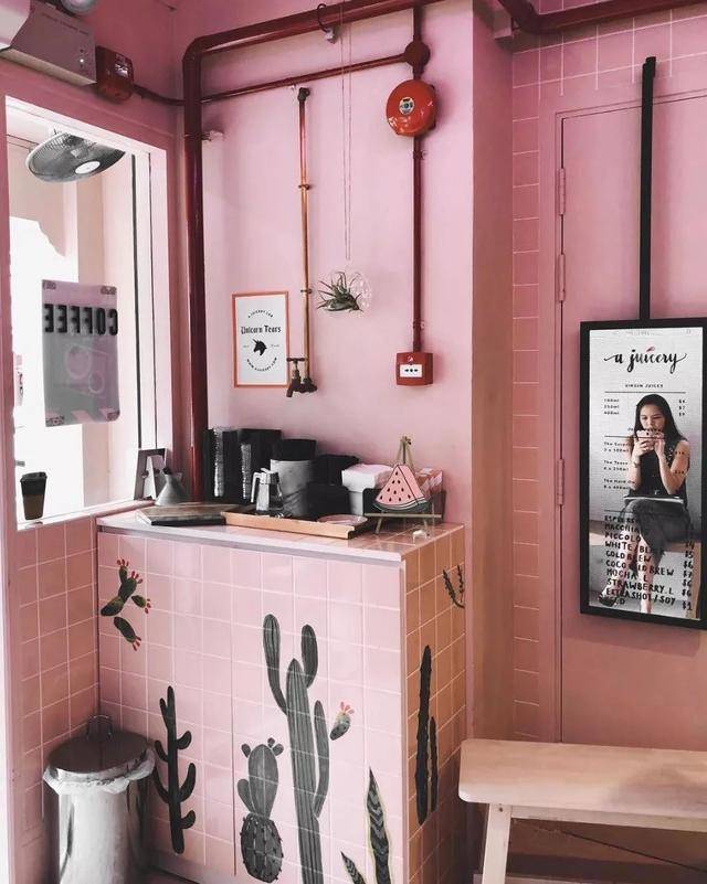 粉色系咖啡店,整个店里都是粉粉简洁的Ins风,每一抹粉色都能俘获你未泯的少女心,主打排毒果汁,草莓拿铁等。
