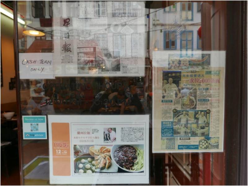 每一碗面的面条都是师傅手工拉制而成,现场拉面就像是在看表演,不但吸引本地人来品尝,就连对拉面相当讲究的日本人也来光顾,餐馆玻璃门上贴满了日本媒体对这家餐馆的推介。