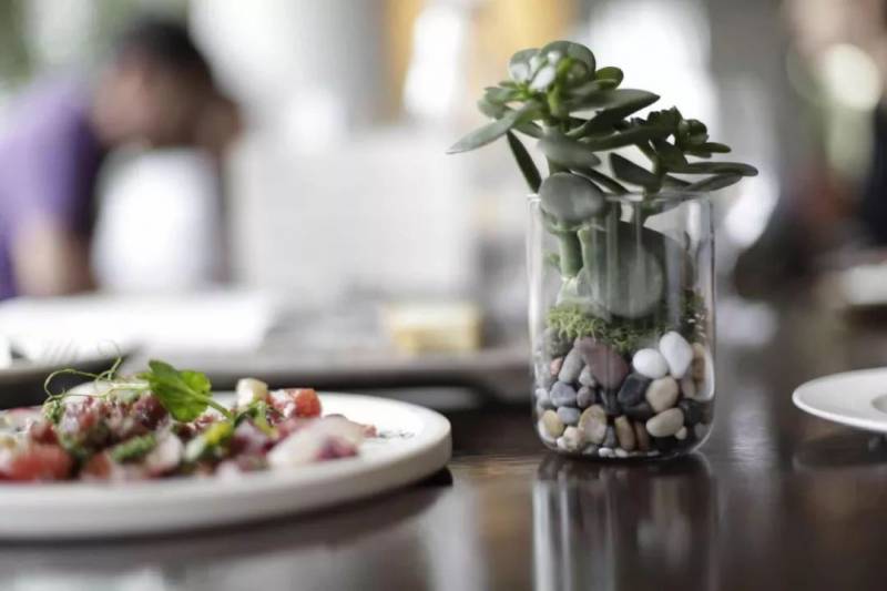 餐桌的周围也摆满了各种植物,整个餐厅都被植物包围着。食物做的非常精致,摆盘很有特色,使用的食材是最新鲜和昂贵的。