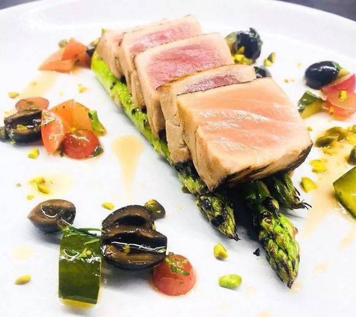太阳落山,灯火亮起来后,看上去特别的温馨。肉质极嫩的吞拿鱼配上新鲜的芦笋,味道细腻。