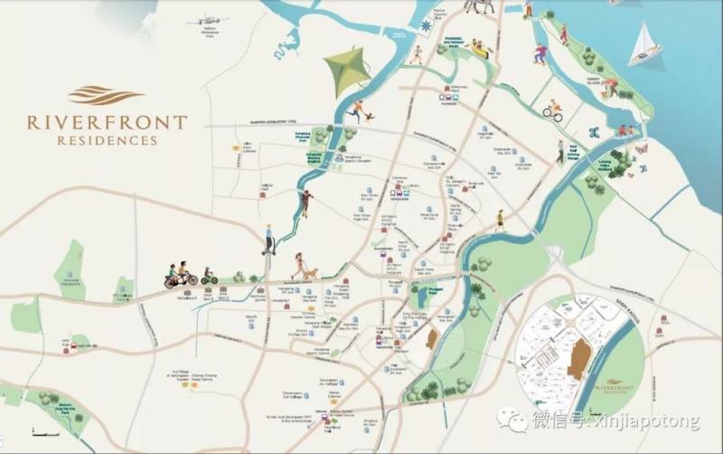 项目位于后港7道,从Riverfront项目步行到后港地铁约10分钟。由于靠近实龙岗水道(Sugei Serangoon),加建筑设计公司考虑周到的设计,大部分单位可以享受无阻挡的漂亮河景(在新加坡河景房属于罕见的),实龙岗水道边上就有公园通道,适合喜欢健身锻炼的朋友,一般跑步健身一边享受河流景观。周围有很多著名小学如圣婴小学,CHIJ女校,榜鹅小学(Punggol Primary School)等。