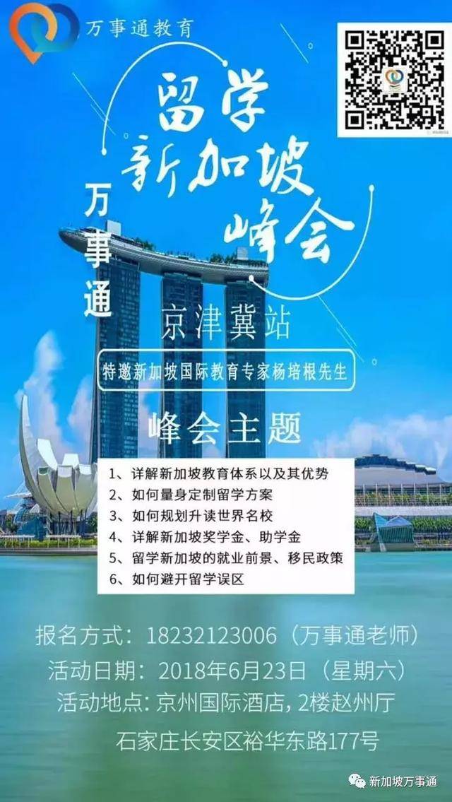 重磅好消息,为了让国内的莘莘学子们的留学之路少走弯路,最快到达目的港湾,【万事通教育】下个周六(6月23日),将在魅力石家庄举办“留学新加坡峰会-京津冀站。