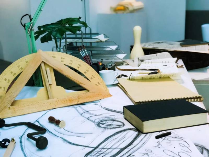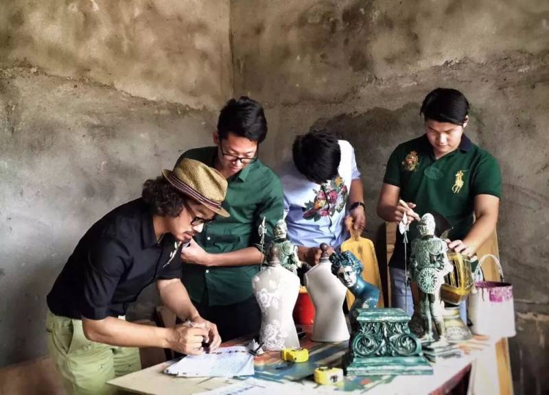 在工作室构思灵感,到不同的地方搜罗各式各样的材料和装饰品,夜深了还在潜心画制蓝色码头的设计手绘图。