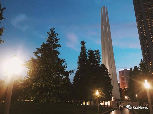 视线越过War Memorial Park中林林丛丛的树,还能看到高楼遮不住的远处的天空,在天光散尽的最后时刻倾情献出一大片粉紫色。一个游客妈妈带着儿子散步,边走边讲一战的故事,男孩子牵着妈妈的手,不知道记住了多少,他望着路边石椅上沉浸在晚风里的大姐姐然后漫不经心地走远。