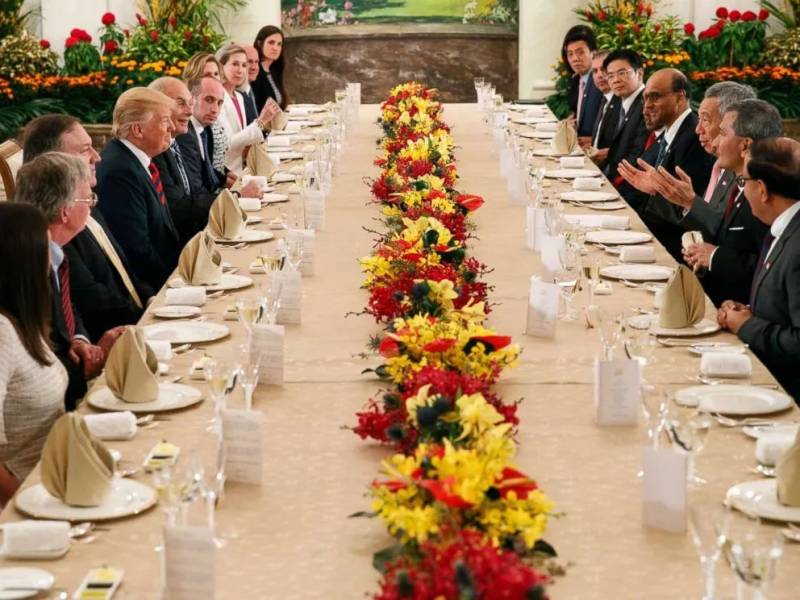 特朗普经过长时间的长途飞行,到达新加坡的隔天和我们的李显龙总理在总统府进行了闭门会谈,在会谈的过程中也享用了午餐并为特朗普提前庆祝了生日。
