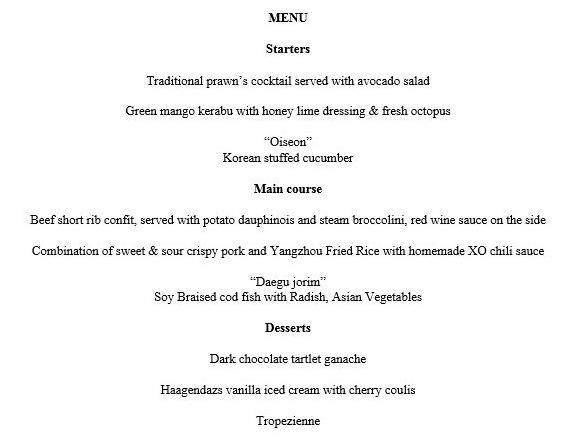 餐点中没有任何的新加坡特色菜,前菜和主菜中都带有美国和北朝鲜特色。主菜的其中一道,居然是咕噜肉和扬州炒饭。