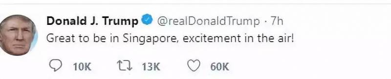 6月11日,特朗普一大早就发了一个推,表示来到新加坡很开心,空气中都弥漫着兴奋~