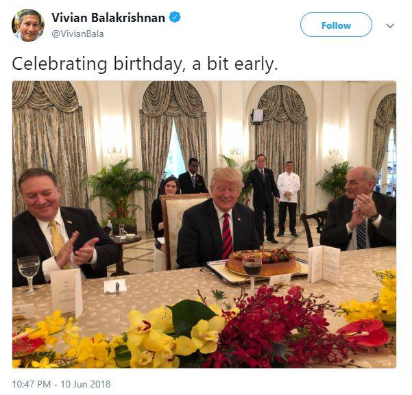 新加坡外交部长维文,也发推表示正和特朗普共进午餐,大家提前庆祝他在14号即将到来的生日~川普,生快!